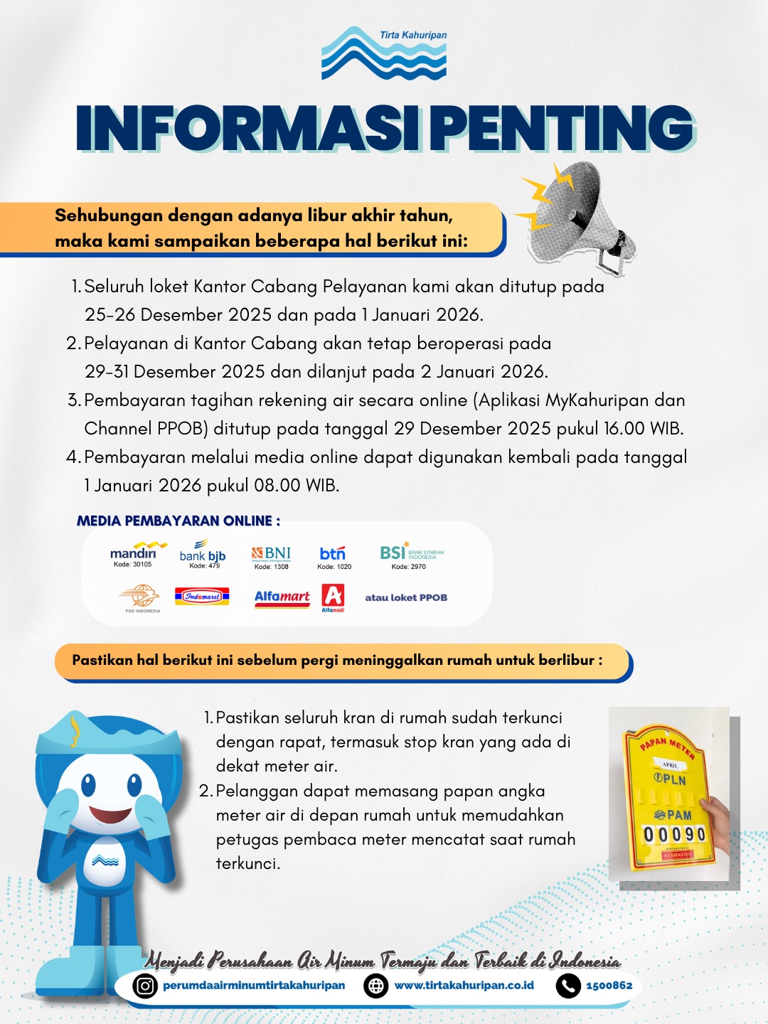3. Pembayaran tagihan rekening air secara online (Aplikasi MyKahuripan dan Channel PPOB) ditutup pada tanggal 29 Desember 2025 pukul 16.00 WIB.